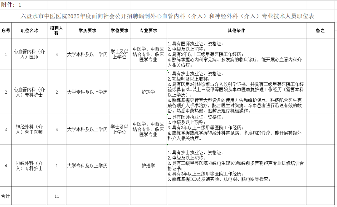 附件1六盤水市中醫(yī)醫(yī)院2025年度面向社會公開招聘編制外心血管內(nèi)科(介入)和神經(jīng)外科(介入)專業(yè)技術(shù)人員職位表.xlsx(點擊下載)
